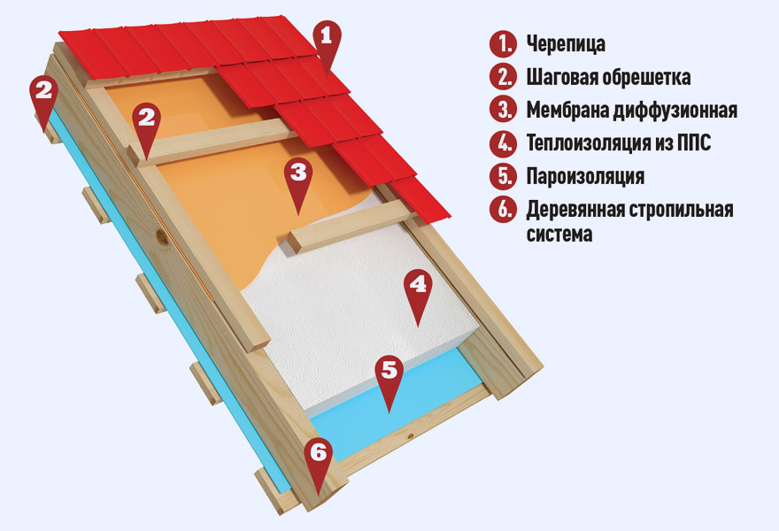 Разработан шаблон спецификации в соответствии с ГОСТ Р 21.1101-2013. Крыша мансардная, состоящая из утеплителя из пенополистирольных плит ППС12-Р, диффузионной мембраны и слоя пароизоляции. Пароизоляционная пленка монтируется со стороны помещения. Применяется в малоэтажном строительстве.