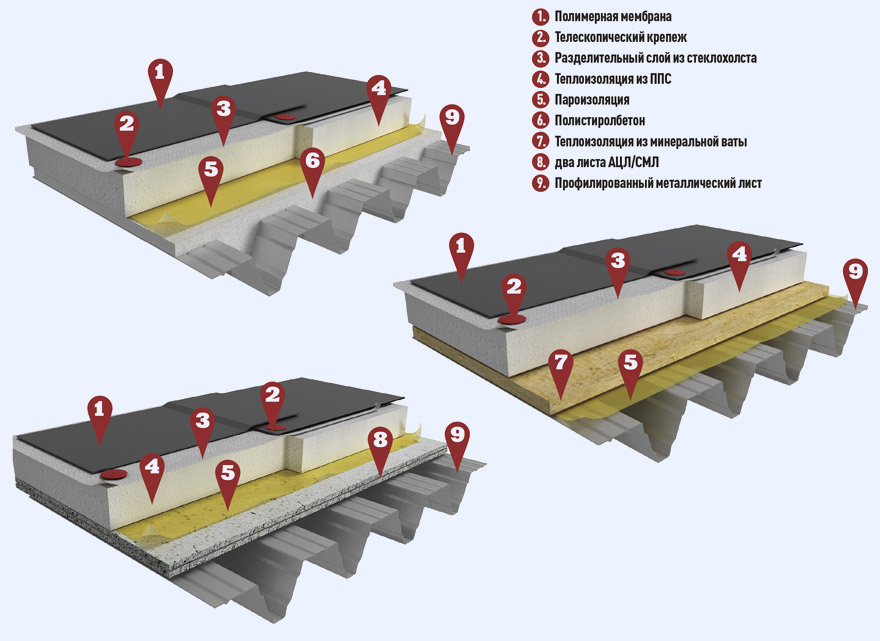 Разработан шаблон спецификации в соответствии с ГОСТ Р 21.1101-2013. Крыша с несущим профилированным настилом с теплоизоляцией из пенополистирольных плит ППС23-Р, минераловатными плитами, пароизоляцией, разделительным слоем из стеклохолста и водоизоляционным ковром из одного слоя ПВХ мембраны. Применяется в многоэтажном строительстве.