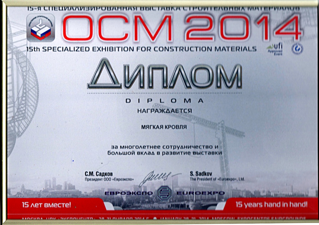 Завод «Мягкая кровля» отмечен дипломом специализированной выставки «ОСМ – 2014».