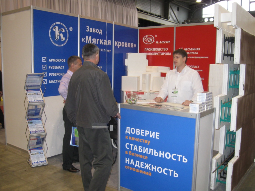 Компании представили свою продукцию: кровельные традиционные, наплавляемые материалы (Армокров, Рубемаст, Рубероид) и изделия из пенополистирола — это несъемная опалубка для стен и фундамента, пенопласт различных марок, формованные плиты, термоконтейнеры, вспененные гранулы, а так же новые виды продукции: изделия фигурной резки(скорлупы теплоизоляционные, декоративные колонны и проч.).